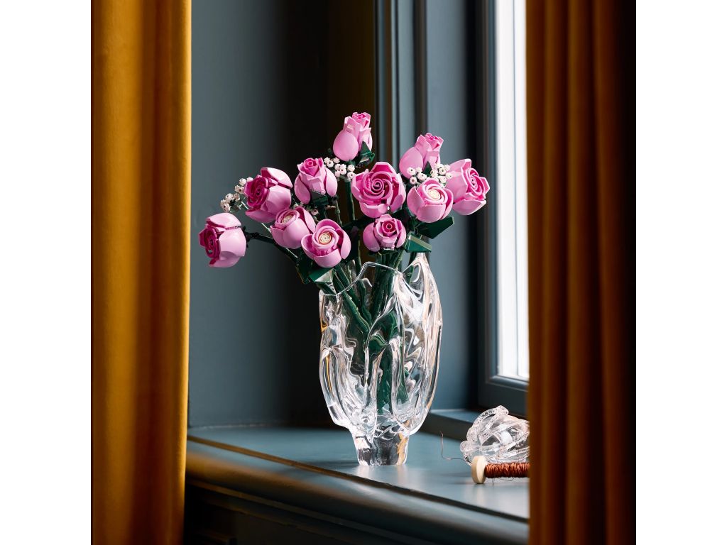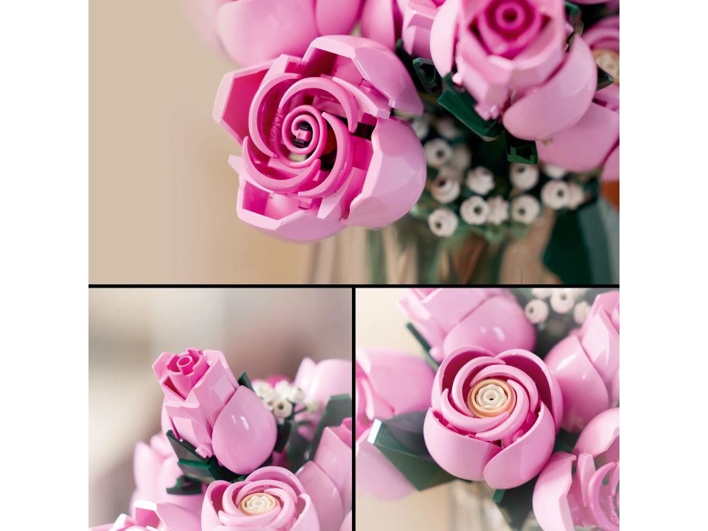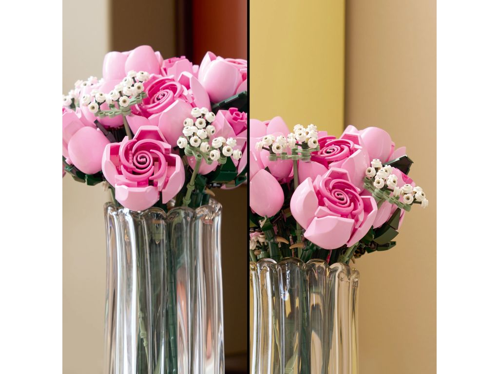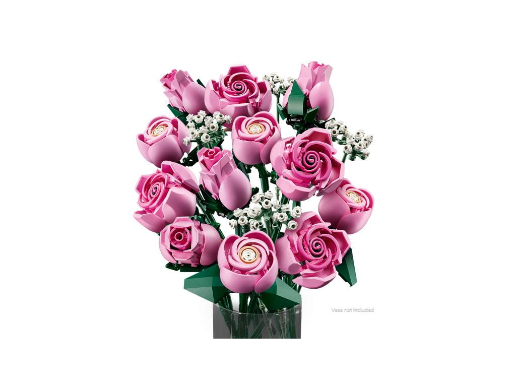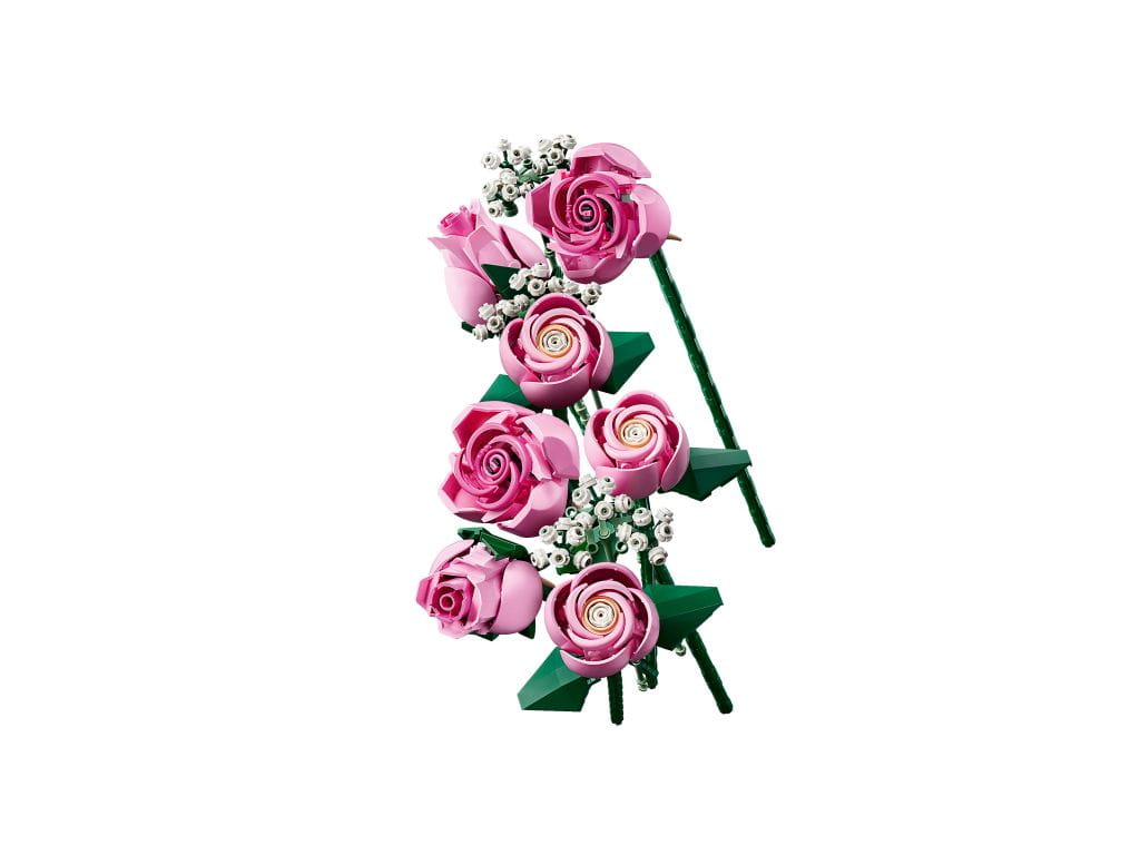 Kwiaty LEGO — zestaw konstrukcyjny zawiera cztery róże LEGO w pełnym rozkwicie, cztery kwitnące róże i cztery pąki róż, a także cztery gałązki gipsówki z białymi kwiatuszkami