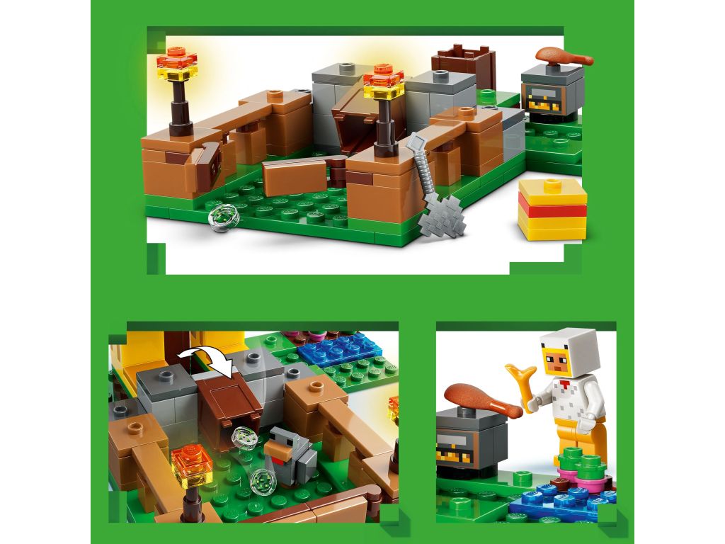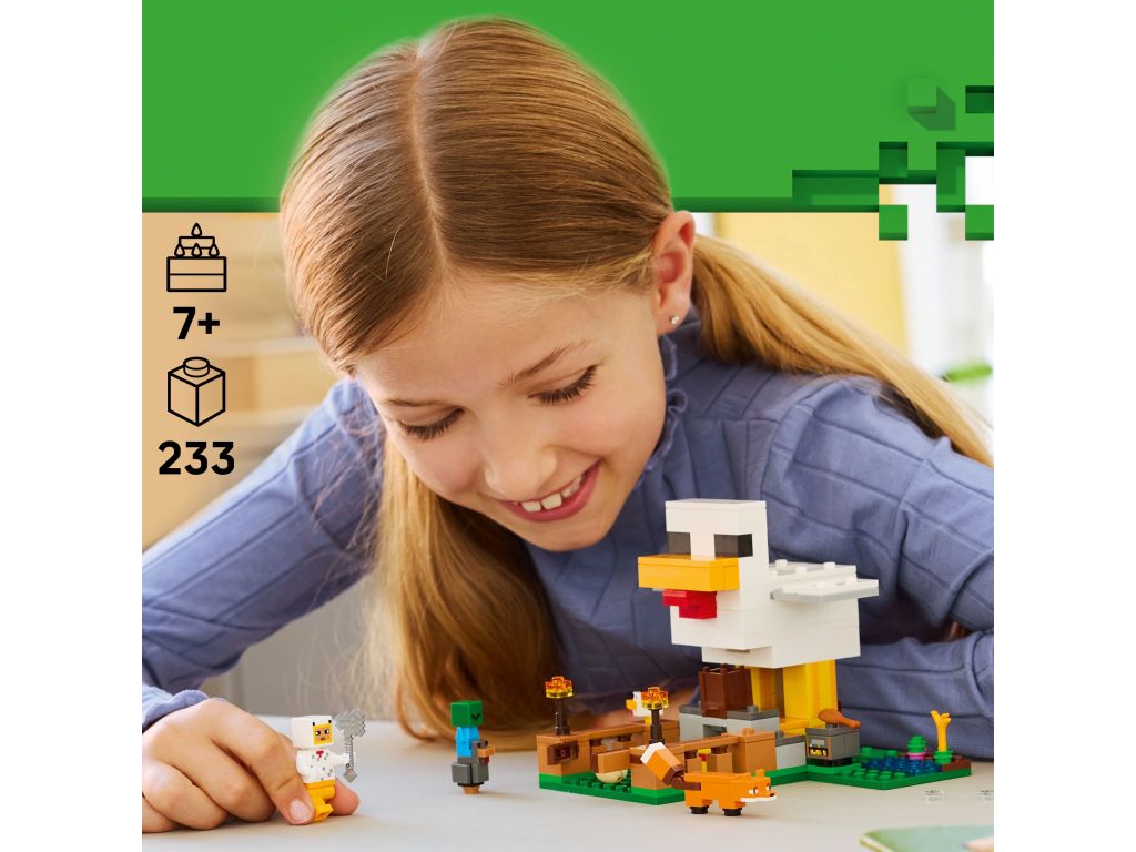 Zabawkowy kurnik dla dzieci ma kształt kurczaka z ruchomymi skrzydłami, zagrodą z przodu i otwieraną bramką. Gigantyczny kurczak LEGO składa jaja z tyłu i wydaje nasiona z dzioba do pojemnika, który przechyla się do przodu, gdy kurczaki potrzebują pożywienia. Ciekawe akcesoria z gry obejmują pochodnie, siano, piec do wędzenia, dwa jajka, dwa zestawy nasion, udko kurczaka, pióro i siekierę.