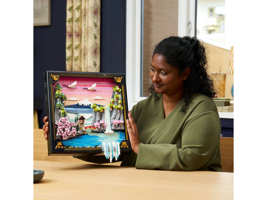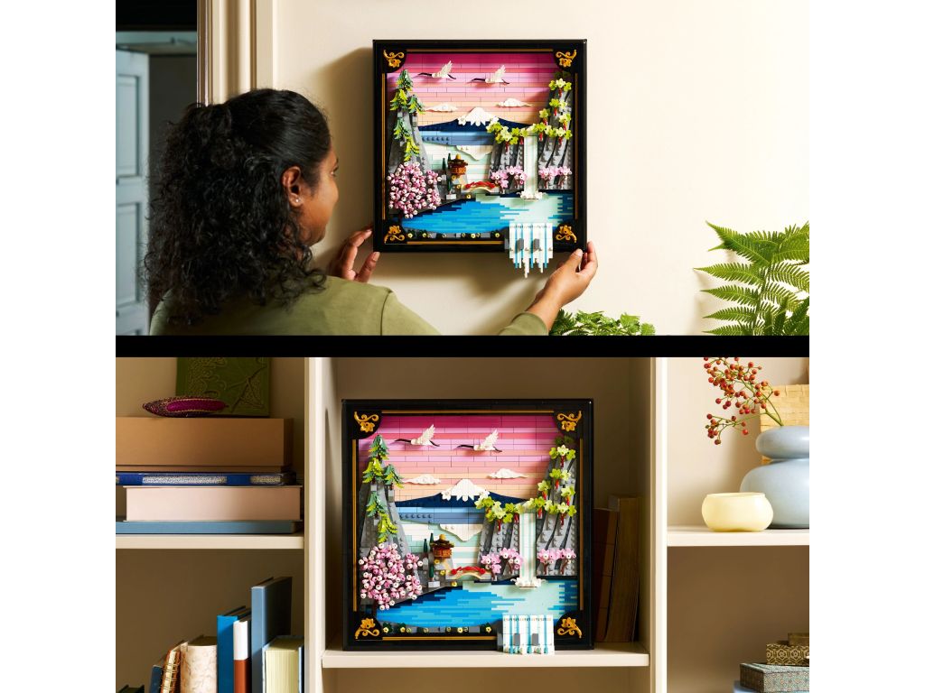 LEGO dekoracja wnętrza - ta japońska dekoracja oferuje dwie możliwości ekspozycji: czarną lakierowaną głęboką ramkę ze złotymi detalami można zawiesić na ścianie lub postawić na płaskiej powierzchni, takiej jak biurko lub półka
