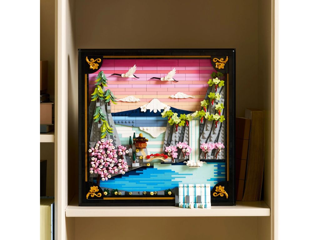 Wprowadź do swojego domu odrobinę koloru i natury z zestawem konstrukcyjnym dla dorosłych LEGO Art Japoński krajobraz z kwitnącą wiśnią (31218). Ta trójwymiarowa dekoracja ścienna jest inspirowana urokiem japońskiej wiosny i sztuką ukiyo-e. Przedstawia tradycyjny, japoński krajobraz: górę Fuji, herbaciarnię, most, wodospad, japońskie żurawie oraz kwiaty wiśni, klon „sango-kku” i japońskie sosny parasolowate.