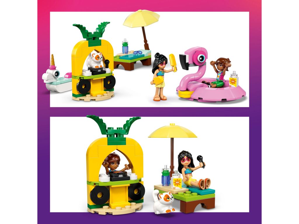 • Dwa materace do zbudowania — dzieci rozwijają swoje umiejętności konstrukcyjne, budując materace w kształcie flaminga i jednorożca oraz scenkę przy basenie, która obejmuje leżak i stanowisko DJ-a