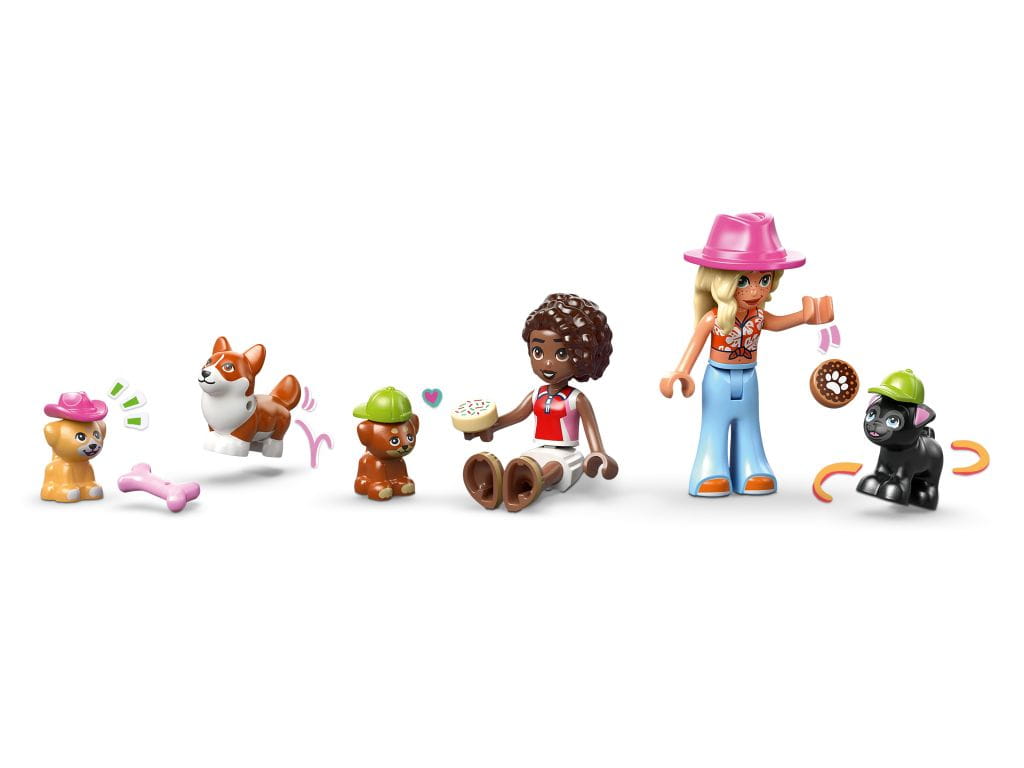 Dwie postacie LEGO Friends - ta zabawka dla dziewczynki zawiera minilaleczki Aliyi i Sage, cztery LEGO pieski i wiele fajnych detali, takich jak drzwi dla zwierząt, rampa, smakołyki, tabliczki i transporter