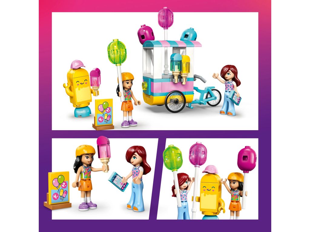Minilaleczki Liann i Paisley pomagają dzieciom wczuć się w historię o przygotowywaniu stoiska do sprzedaży balonów i lodowych przysmaków. Liann ma kask i jest gotowa do jazdy na rowerze, który ciągnie stoisko z zabawkowym jedzeniem. Zabawa trwa dzięki uroczej maskotce w kształcie lodów, a także menu, kasie fiskalnej i telefonowi. W zestawie LEGO dla 6-latki jest też stół, przy którym przyjaciółki spędzają razem czas.