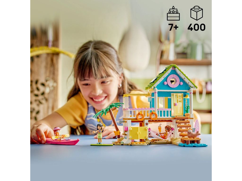 LEGO Friends Domek na plaży z fokami, zabawka dla dzieci z 3 minilaleczkami, 2 figurkami zwierząt, kajakiem i hamakiem, klocki do zabawy w dom, prezent dla 7-latki, dla dziewczynki i chłopca 42699