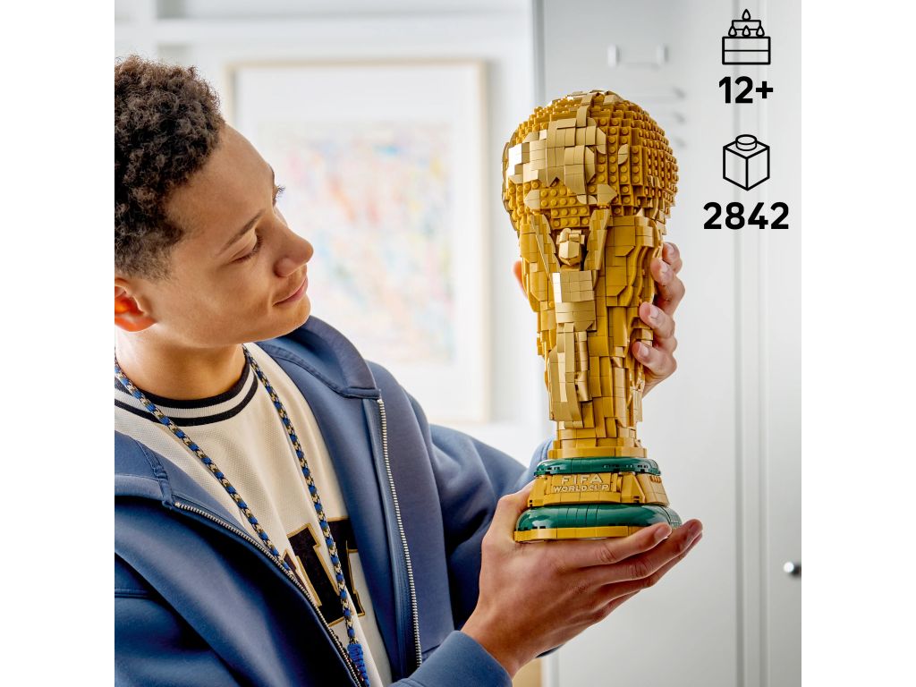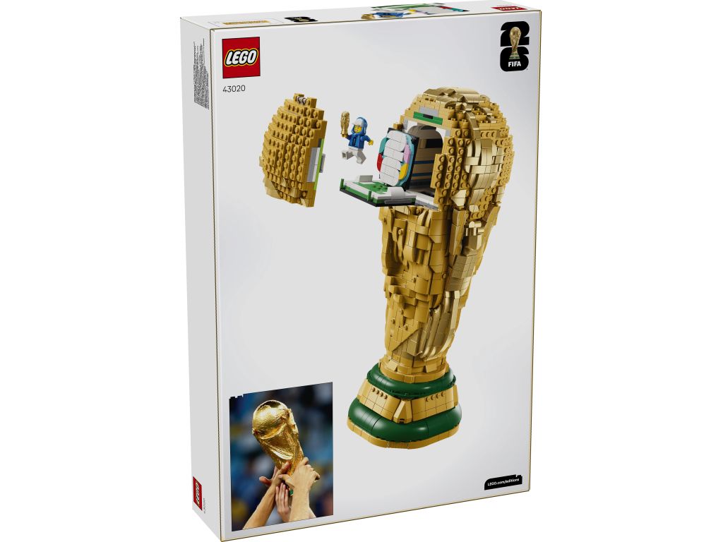 Dzięki tej zabawce konstrukcyjnej dla chłopca i dziewczynki młodzi kibice piłkarscy będą mieć mnóstwo frajdy, budując replikę trofeum Mistrzostw Świata z klocków LEGO i odkrywając jego autentyczne detale. Puchar LEGO przedstawia dwie splecione postacie podtrzymujące Ziemię, kultową kulę oraz tabliczkę u dołu z nazwami dotychczasowych zdobywców Pucharu Świata. Górna część trofeum LEGO z kulą otwiera się, odsłaniając minifigurkę z logo Mistrzostw Świata FIFA 2026 trzymającą miniaturowy puchar oraz tło z logo Mistrzostw Świata 2026. Scenkę można przechowywać wewnątrz trofeum lub wyjąć i ustawić obok niego.