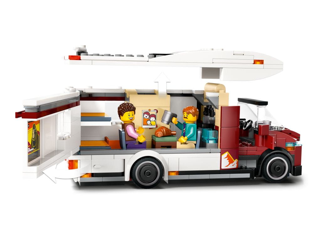 • Zawartość zestawu — zestaw zawiera wszystko, czego dzieci potrzebują, by zbudować kampera z przestrzenią mieszkalną, a także ognisko, dwie minifigurki i figurkę dziecka