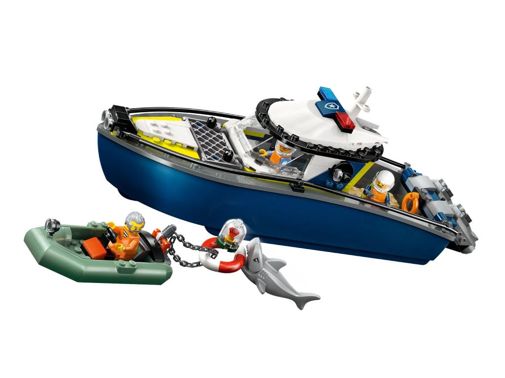 • Zawartość zestawu — wszystko, czego dziecipotrzebują do zbudowania policyjnej łodzi i pontonu złodziejaszka, a także minifigurki dwóch policjantów, złodziejaszka i figurka rekina