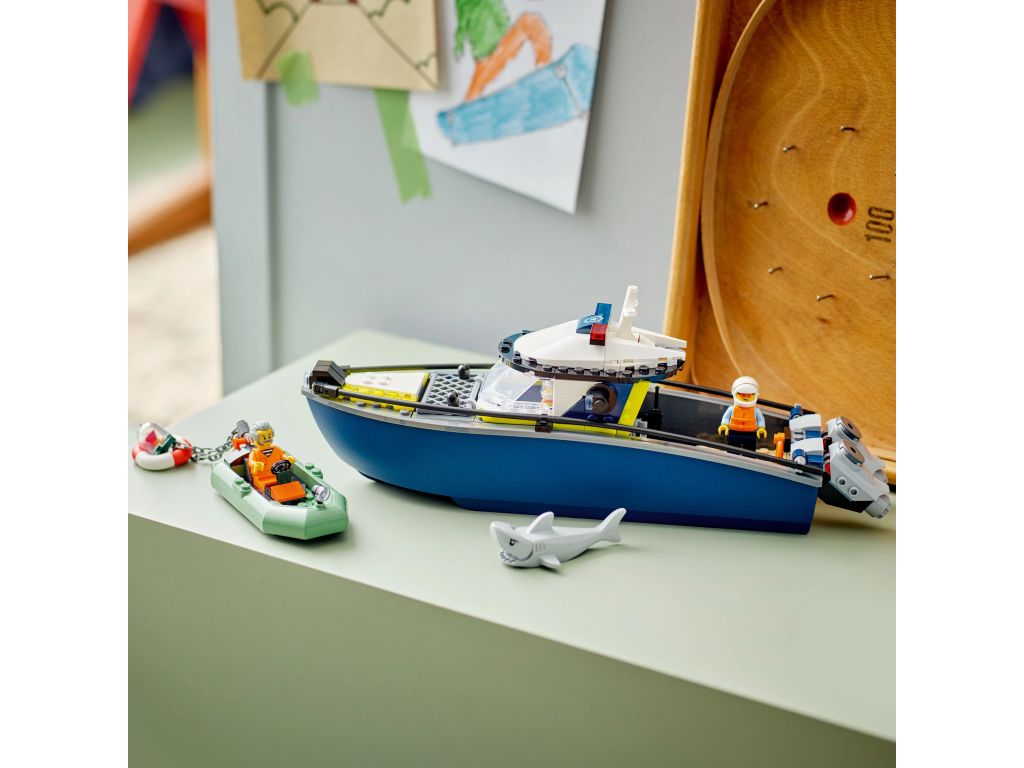 • Cechy i funkcje — dzieci mogą posadzić dwie minifigurki policjantów w kokpicie łodzi policyjnej, zamknąć złodzieja szka w celi i umieścić na wodzie zarówno ponton, jak i łódź policyjną, aby odgrywać realistyczne scenki