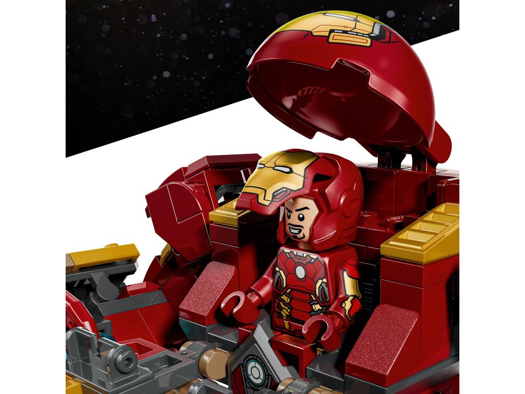 LEGO mech i dwie minifigurki — zestaw zawiera w pełni ruchomego Hulkbustera oraz minifigurki Iron Mana i Hulka