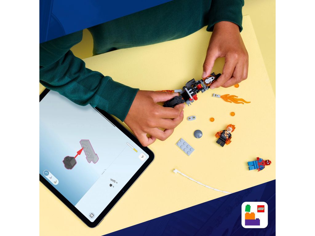 Epickie bitwy z zestawem LEGO | Marvel dla dzieci — dzieci mogą organizować szybkie pościgi, w których Spider-Man rzuca swoją pajęczą siecią w motocykl Ghost Ridera, a z rury wydechowej i rąk złoczyńcy strzelają płomienie