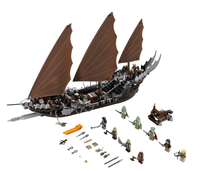 Nad brzegiem przy Minas Tirith orki Saurona z Mordoru przygotowują się do powitania sojuszników przybywających pirackim statkiem - ale pozory mylą. Zatrzymaj się przy nich, zrzuć kotwicę i poprowadź atak z zaskoczenia jako Aragorn, Gimli, Legolas i Armia Umarłych. Ten majestatyczny korsarski statek ma 3 duże żagle, zdejmowaną tylną część z lochem i więźniem - korsarzem z Umbaru, działającą kuszę i mnóstwo broni oraz zbroi! Przejmij katapultę Orków i poprowadź świecącego w ciemności Króla Umarłych oraz jego żołnierzy do boju w Wojnie o Pierścień! Zestaw zawiera 9 minifigurek z bronią i dodatkami: Aragorna, Legolasa, Gimlego, 2 orki z Mordoru, Króla Umarłych, 2 żołnierzy Umarłych i korsarza z Umbaru.